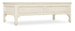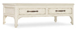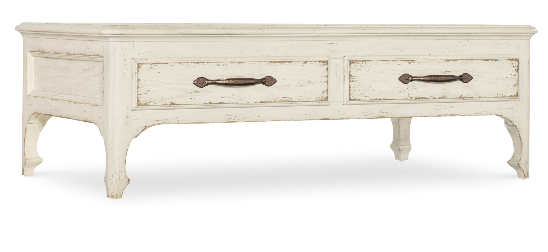 Unit price perIn a classic, charming design with a nostalgic flair, the 58W x 32D rectangle-shaped Americana Cocktail Table has scalloped shaped legs and is finished in the time-worn white Daisy over Cathedral Oak Veneers. The finish represents the natural wear one might expect of pieces passed down through the family over time, revealing the rich oak character beneath. The table has a Solid-Wood Edge top, two self-closing drawers with drawer interiors in the Honey finish and metal alloy bar pulls in an antique bronze finish.