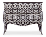 Reimagining an historical design, the Americana Bombay Chest contrasts the deep, dark Molasses finish with a white fleur-de-lis pattern over the exterior. The two self-closing drawers have a Honey-finished interior. Crafted of Oak Veneers with metal allow tear-drop pulls in an antique bronze finish.