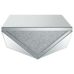 This mirrored coffee table set exudes modern luxury with bold, diamond-shaped designs. Including a coffee table and end table, both pieces feature triangular mirrored surfaces and glittery material for a glamorous touch. The square, reflective tops enhance their elegance, while the striking geometric bases make them perfect for adding a statement of opulence to contemporary interiors.