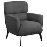 Check all the boxes for a comfortable and stylish addition to your living space. This chic accent chair reflects the best of both modern and transitional style elements. Gorgeous upholstery covers a chair made of wood products and padded with foam to create a luxurious seating experience. Rounded track arms and a deep non-removable seat cushion embellish the design of a chair that coordinates with a sleek seating group or sits alone in a library or bedroom. Set atop chic black metal legs, this chair becomes a favorite spot for stylish relaxation.
