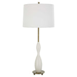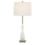 • The Soft Silhouette For This Lamp Makes It Versatile In Most Settings By Showcasing A Casted Curvy Base Finished In A Glossy White Paired With Antique Brass Plated Details.