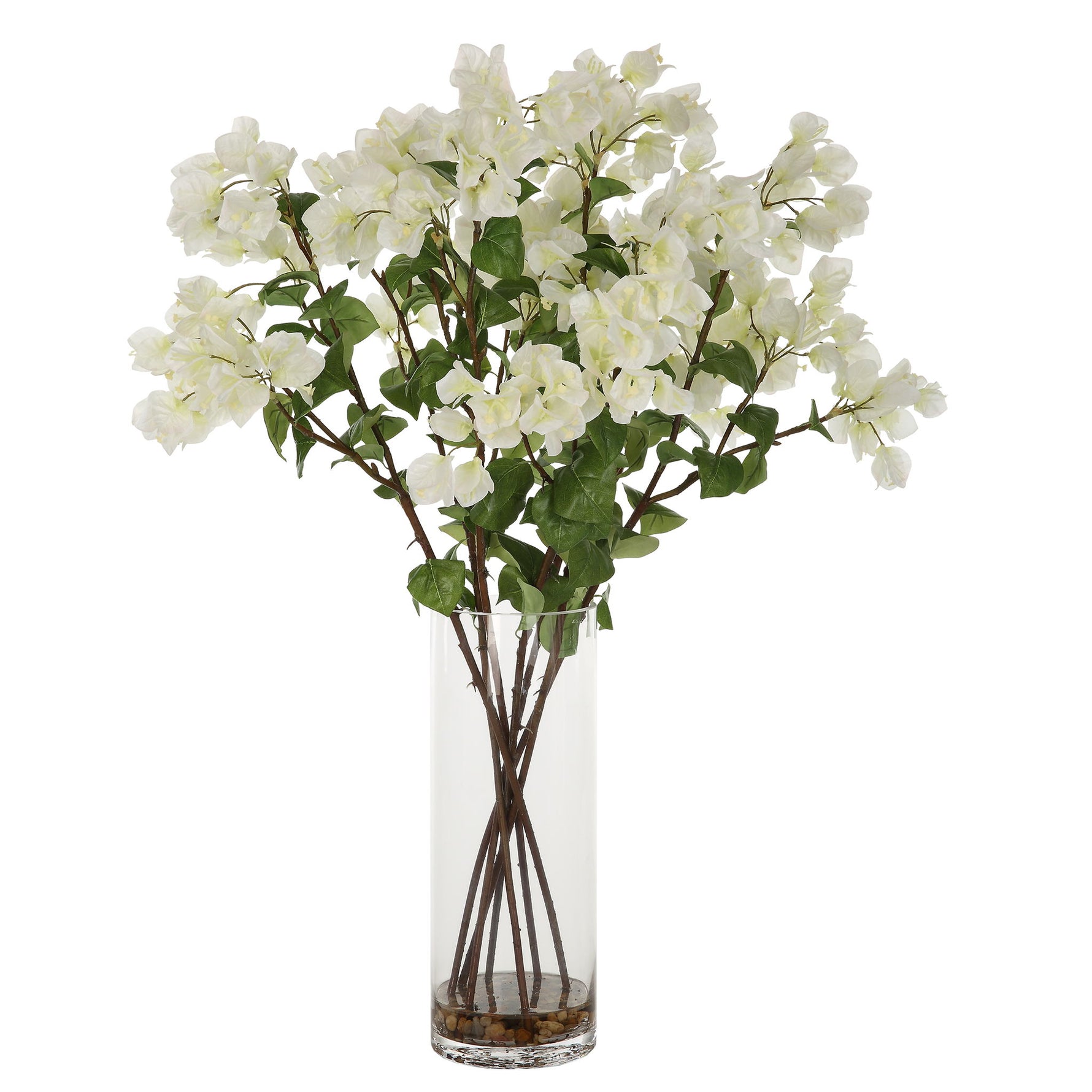 Effortlessly Arranged As If Freshly Cut, These Bougainvillea Branches Exemplify The True Characteristics Of Live Florals. Cream Blooms Are Accented By Natural Rocks In A Clear Glass Vase.