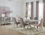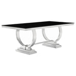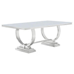 Create an opulent air of sophistication with this elegant dining table. a long and spacious tabletop seats six guests rather comfortably. slide up a chair beneath its opaque white tempered glass surface for formal dinners and casual gatherings. supporting the tabletop is a trestle-inspired stainless steel base with ring-shaped end supports, all of which boast a gleaming chrome finish that reflects the dining room's color palette like a chic mirror. available within this same collection are a delicate light pink and grey slipper style dining chairs, accenting the exquisite nature of the table even further.