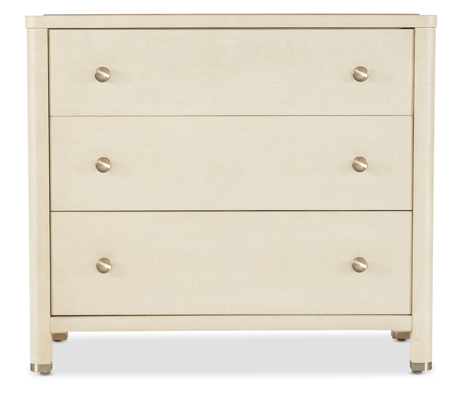 The Archives Raffia Three-Drawer Chest brings natural textures to your bedroom décor with its raffia-wrapped exterior and Flax finish. This chest offers three spacious drawers, complete with oak veneered sides and bottoms. The combination of raffia and woven cane details adds a unique touch of coastal elegance to your space.