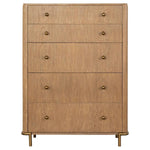 This charming mid-century, modern, five-drawer chest offers a gorgeous contemporary glam look with its softly rounded corners and aged brass metal hardware. A neutral sand wash wood tone with a wire-brushed finish adds texture and warmth to bedrooms. Clever details like a soft felt-lined top drawer for delicates offer a finishing touch to complete your sophisticated bedroom retreat.