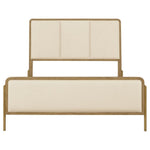 Elevate your coastal bedroom with this stunning panel bed, designed with retro-inspired elements and luxurious details. Fabric upholstery on the headboard and footboard is framed by a sleek edge, creating a bold contrast and soft texture. The aged brass metal legs introduce a metallic accent that enhances its glamorous appeal. Crafted from Asian hardwood, plywood, engineered wood, and ash veneer, this bed combines durability and sophistication for a timeless centerpiece.