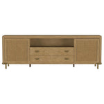 This refined entertainment unit transforms your living room with artisanal detail. Accommodating up to 85-inch displays, this TV stand integrates Asian hardwood, engineered wood, ash veneer, and rattan. A modern neutral finish and aged brass legs exude timeless appeal. With drawers and hidden storage, it excels as a media console or TV shelf. A versatile TV console and media stand, it ensures an elegant entertainment center and functional media cabinet.