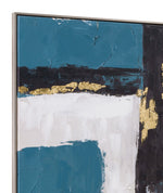 The Around About Framed Canvas features a contemporary abstract design with rich teal tones, accented by bold strokes of black and pops of gold. The vibrant colors and dynamic composition create an engaging focal point for any space. Wrapped in a muted silver frame, this piece adds a touch of sophistication while maintaining a modern edge. Whether placed in a living room, hallway, or any area in need of artistic flair, the Around About Framed Canvas brings both style and personality to your decor.