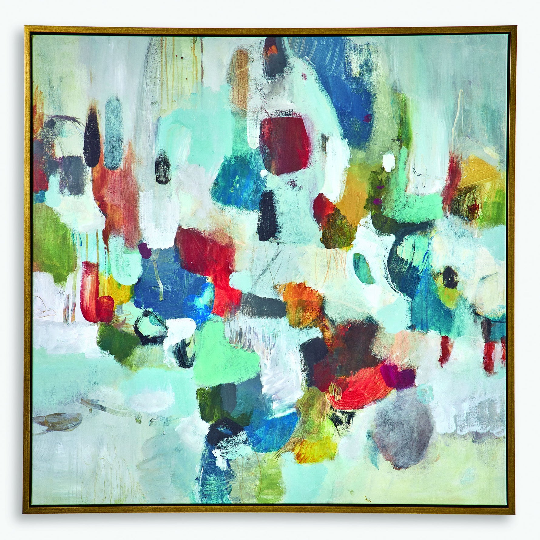 Giclee On Canvas, This Abstract Piece Features Shades Of Gray, Blue, And Burgundy Highlighted With Pops Of Olive And Mustard. A Solid Wood Gallery Frame With Gold Finish Completes The Artwork. May Be Hung Horizontal Or Vertical. Each Canvas Is Proudly Handcrafted And Printed In The USA. Artwork By Lisa Ridgers.