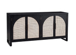 The Ashton Server is of a modern, boho inspired styling with arched door inserts and a sled style base. The natural finished open box-weave cane doors contrast with the clean, matte black oak finish of the case. The case features antique brass bar pull hardware. There are four doors that open to two large cabinets, each with two adjustable shelves and media cord management cutouts.
