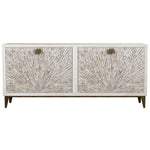 The Astrid Server seamlessly blends modern Boho aesthetics and functionality . Featuring four doors adorned with a playful mix of hand-stained bone, resin, and wood chips in a lively sunburst pattern. The solid mango outer frame, in a white wash finish, harmonizes with an antique gold metal base and custom hardware. Inside, find two fixed shelves and practical cutouts for effortless media cord organization. Enhance your space with this distinctive fusion of style and utility.