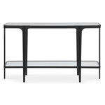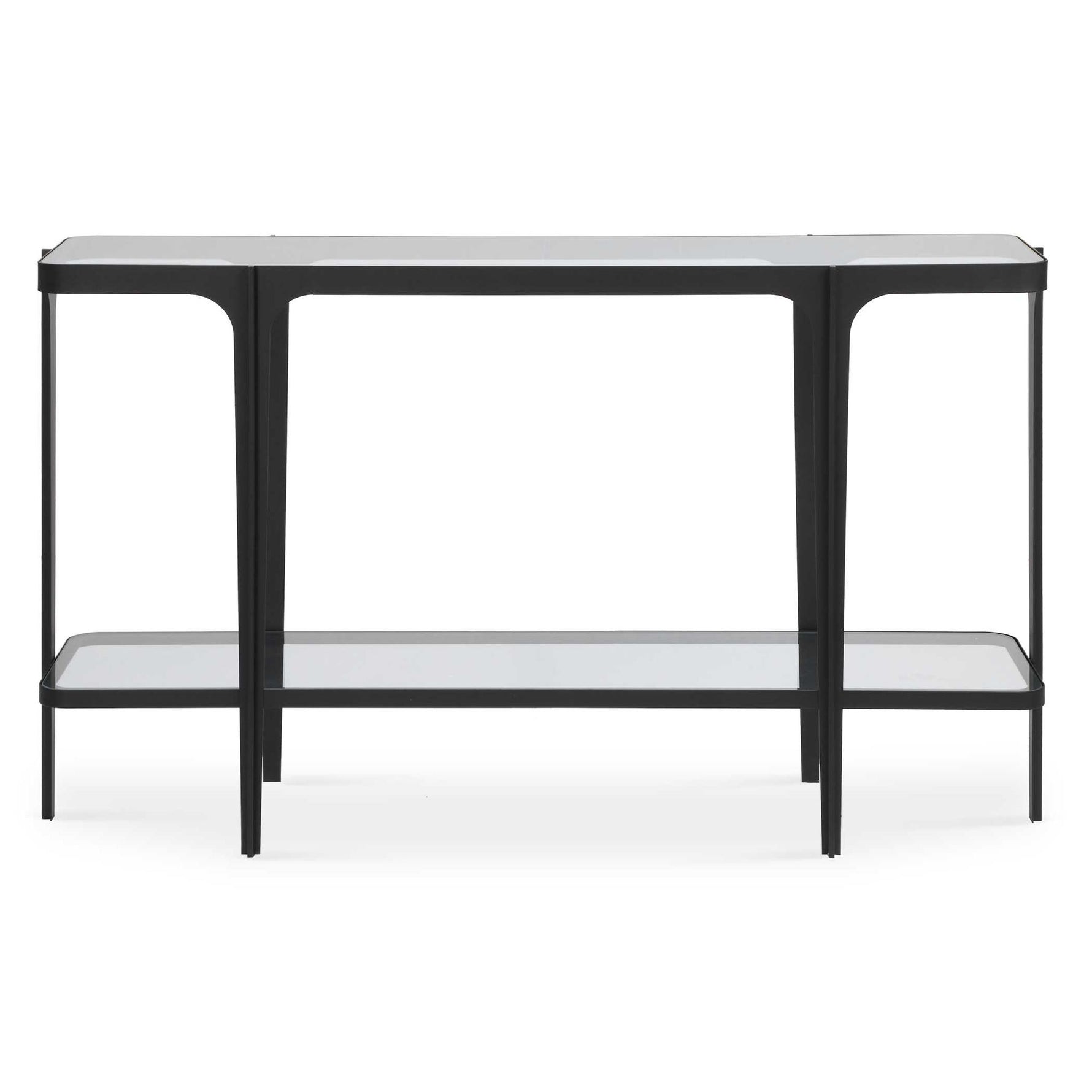 - Boasting Sleek, Clean Lines With Gently Curved Corners And A Satin Black Iron Frame, This Uniquely Designed Console Table Brings A Relaxed Elegance To Any Room. It Includes A Tempered Glass Top And Bottom Shelf.