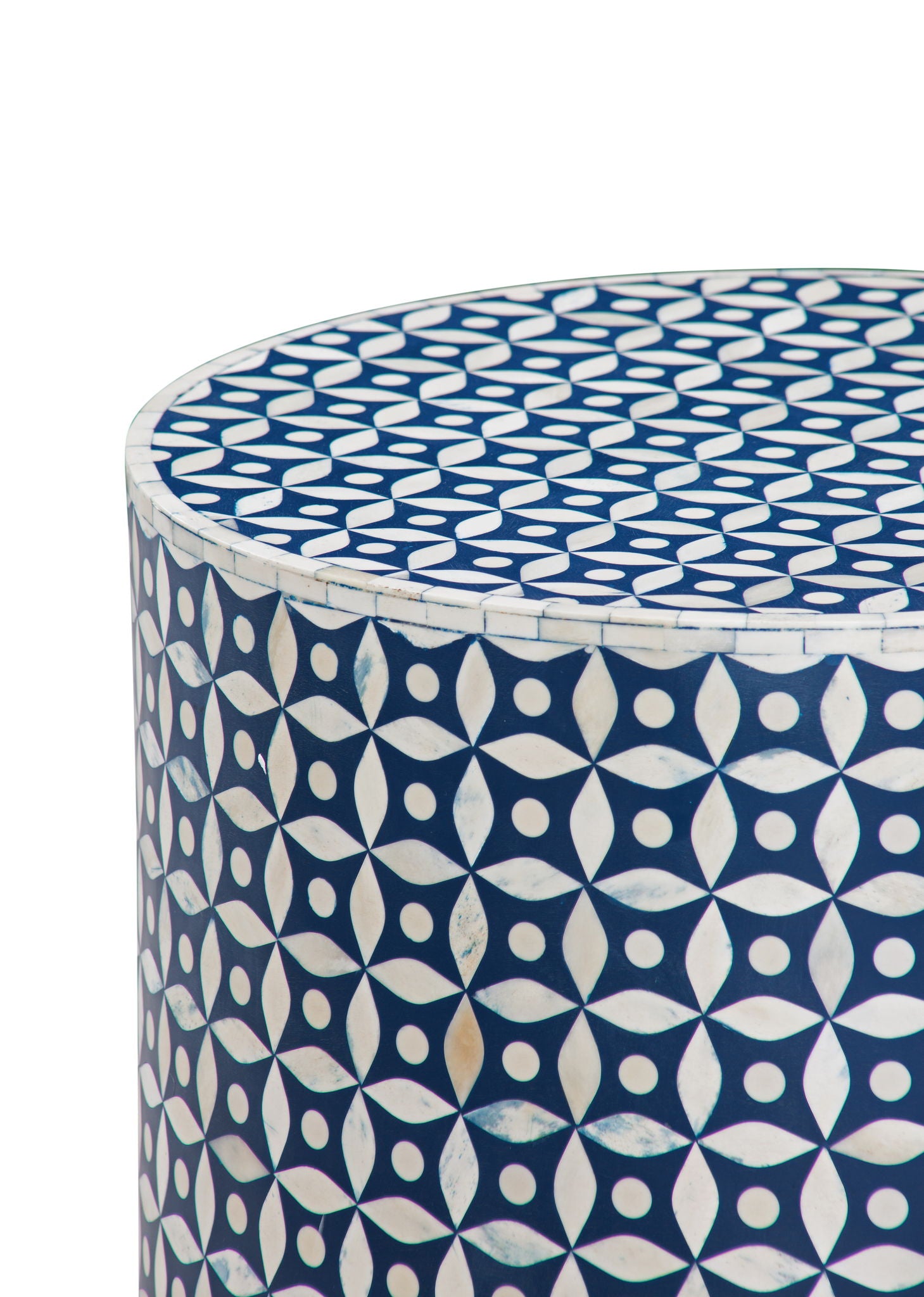 Attic Accent Table is a round scatter table with a diamond patterning alternating natural bone and blue resin,