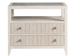 The Carmen Two-Drawer Nightstand is a stylish and functional addition to any bedroom. Its two spacious drawers, adorned with sleek metal ring pulls, offer ample storage for bedside essentials. The open shelf, accented by an inset stone top, adds a touch of luxury and provides a convenient space for displaying books or decorative objects.
