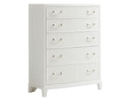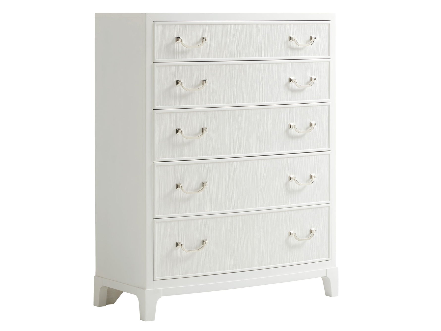 - The Danielle Drawer Chest Features A Graceful Bowfront Design, With Texured Veneer On The Framed Five Drawer Fronts And Polished Nickel Hardware Above Bracket Feet