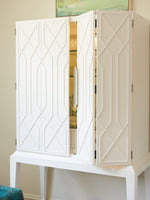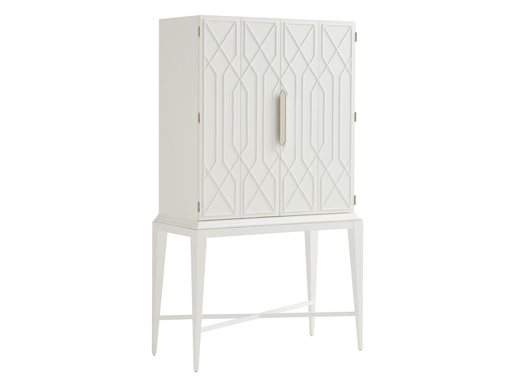 - Upper Section: 2 Bi-fold Doors With Decorative Contemporary Fretwork, 3 Adjustable Glass Shelves, Pull-out Gray Laminated Serving Shelf, Mirrored Shelf, 2 Drawers (right Side Drawer Has A Sliding Storage Box), Grommets For Cord Management, Mirrored Back, Touch Led Strip Lighting With Dimmer Switch