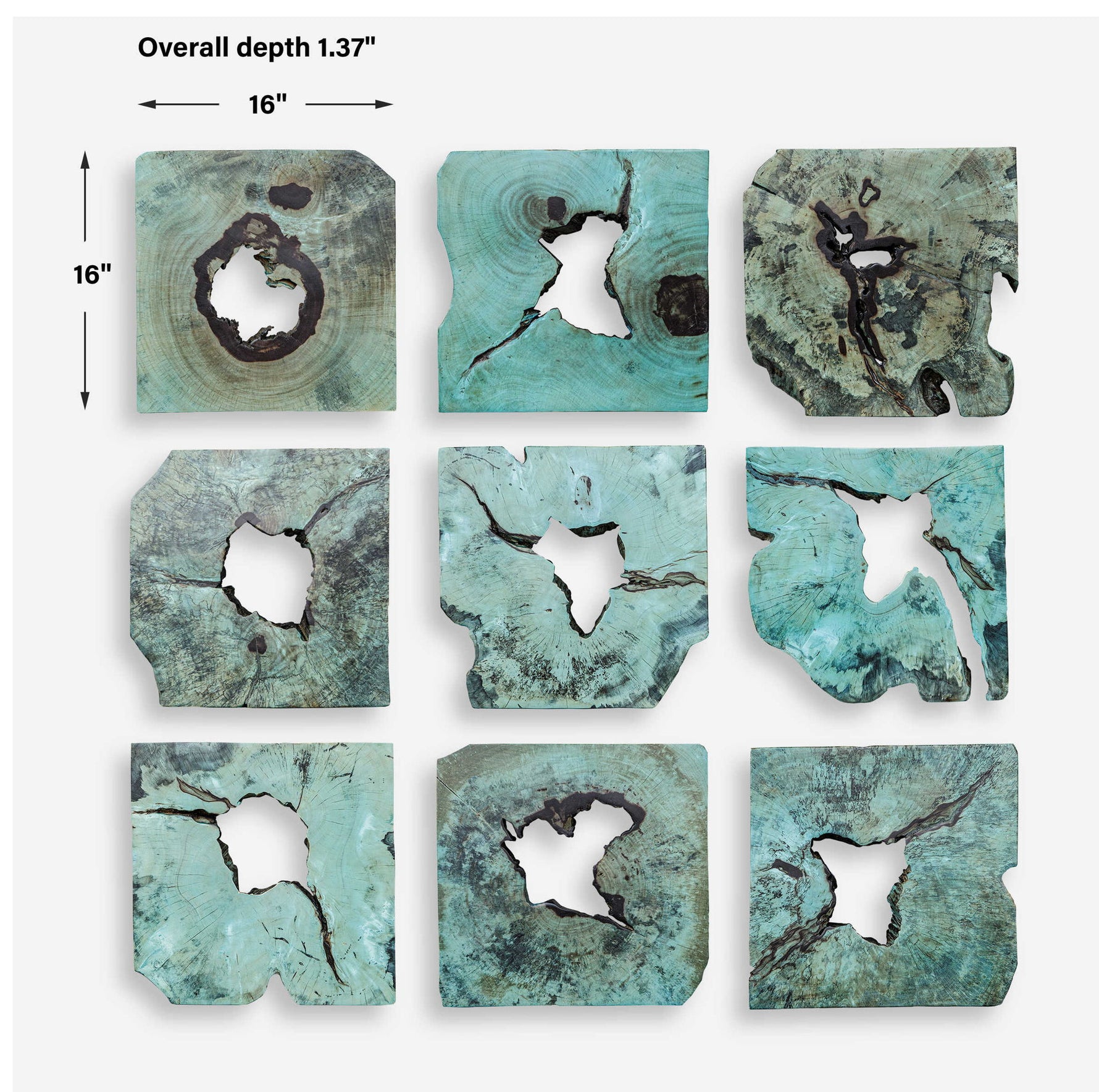 - This Set Of Nine Wood Wall Pieces Is Crafted From 100% Natural Tamarind Wood In A Blue Green Finish. Because Each Is Individually Handcrafted, Natural Variation Will Occur From Piece To Piece.