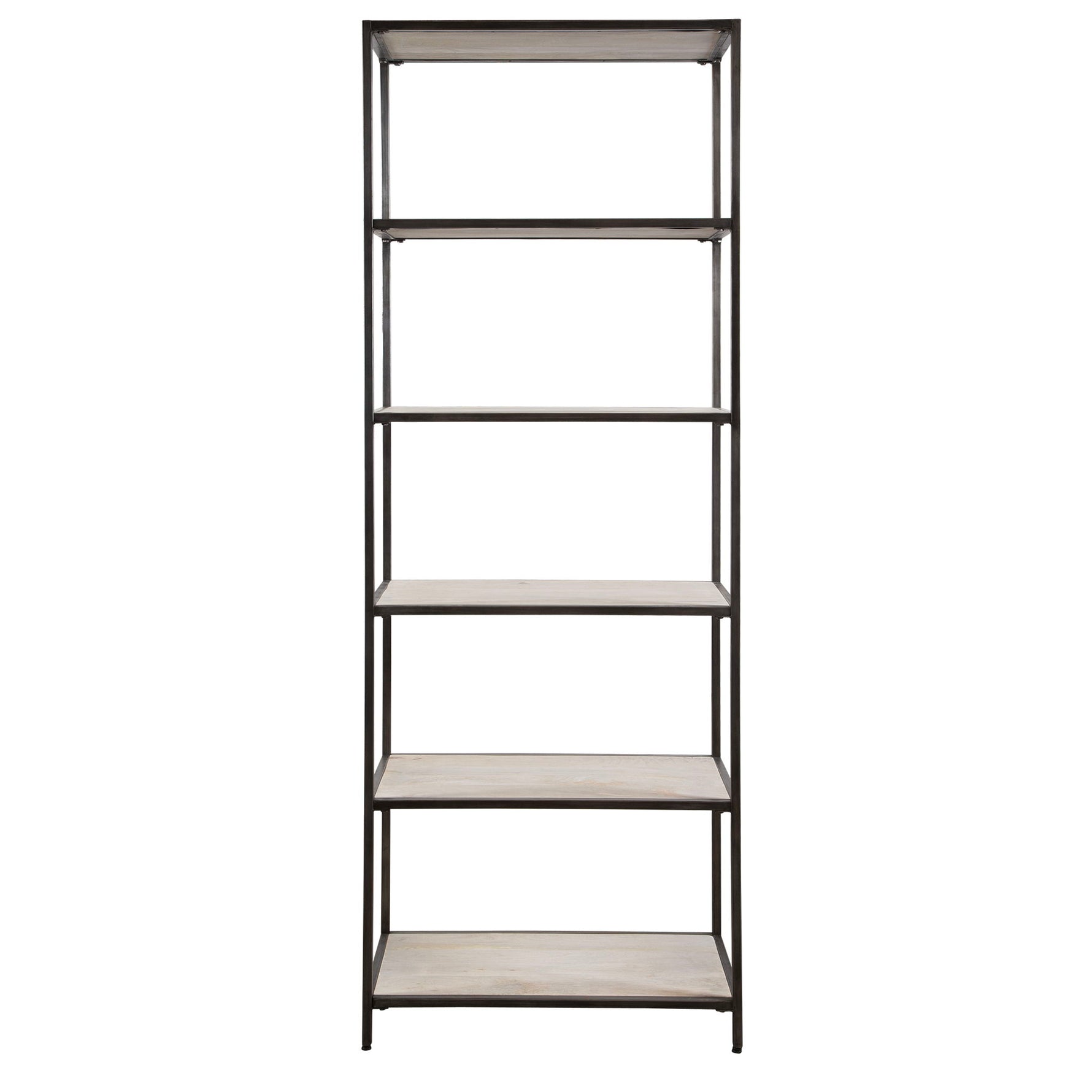 Boasting With Display Space, The Baldwin Etagere Is A Versatile And Streamlined Piece That Has A Place In Any Home. The Iron Frame Is Finished In Clean Gunmetal With 5 Shelves In White Washed Mango Wood. Distance Between Shelves Is 16".
