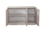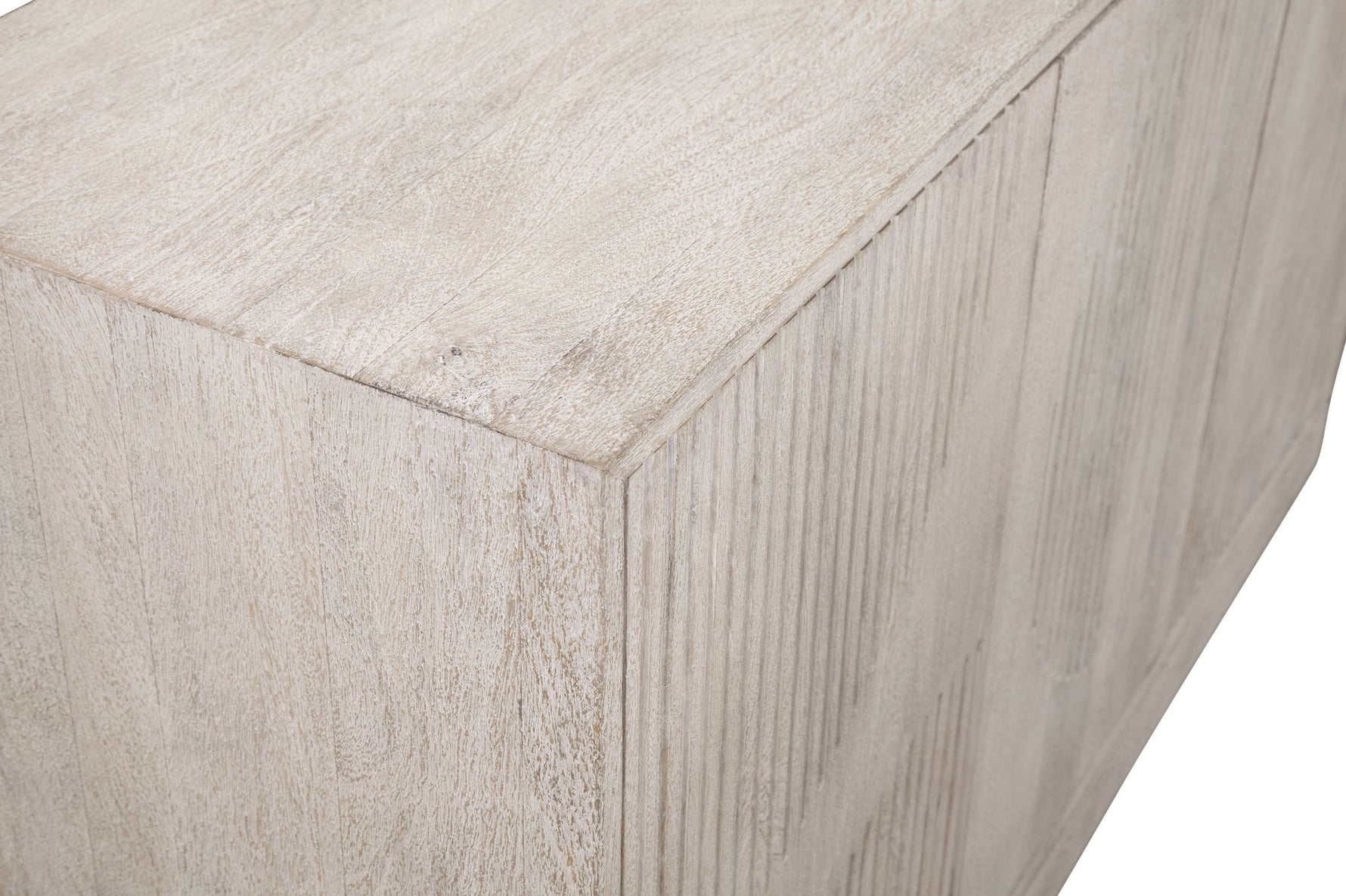 The Bali Server seamlessly blends modern coastal farmhouse design and practical elegance. Crafted from solid mango in a soothing white-wash finish, this server combines style and functionality. Mango wood boasts a naturally textured finish with a charming distressed effect. Adorned with three doors featuring semi-circle routed design and push-clasp hardware, it offers a thoughtful interior with fixed shelves and media cord management.