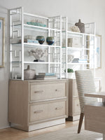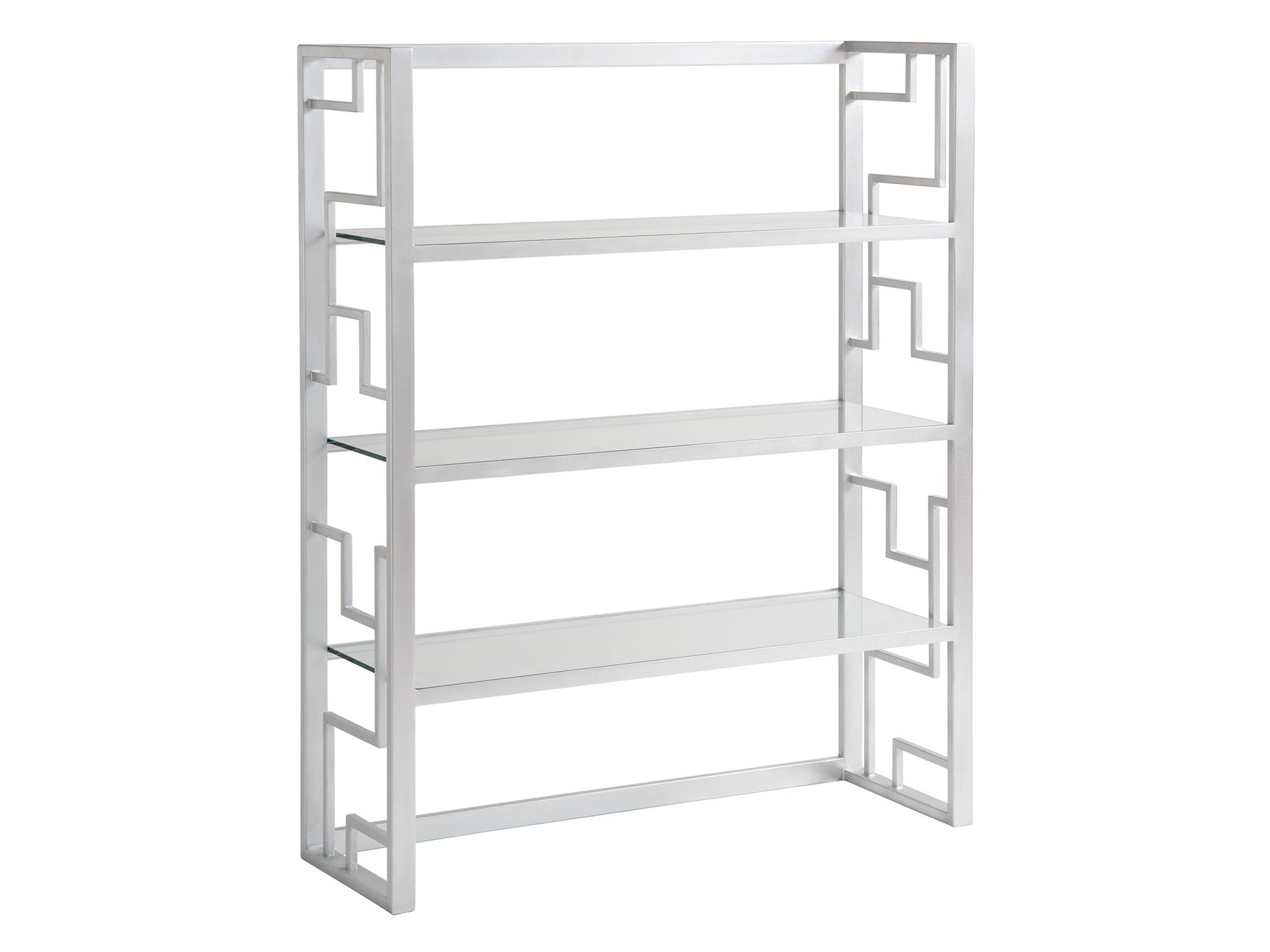• Contemporary Designed Metal Frame And Decorative Fretwork In Silver Leaf Finish With Three Stationary Glass Shelves And An Open Back. The Wheaton Deck Complements The -450 Wheaton File Chest.
