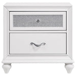 Bring a bit of glam and glitz into your personal space. This gorgeous nightstand is embellished with touches of sparkle to add a pop of pizzazz to any bedroom.The faceted crystal hardware glistens and gleams. Equipped with two drawers for your storage convenience, this stunning, modern nightstand keeps a bedside organized in style.