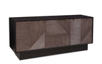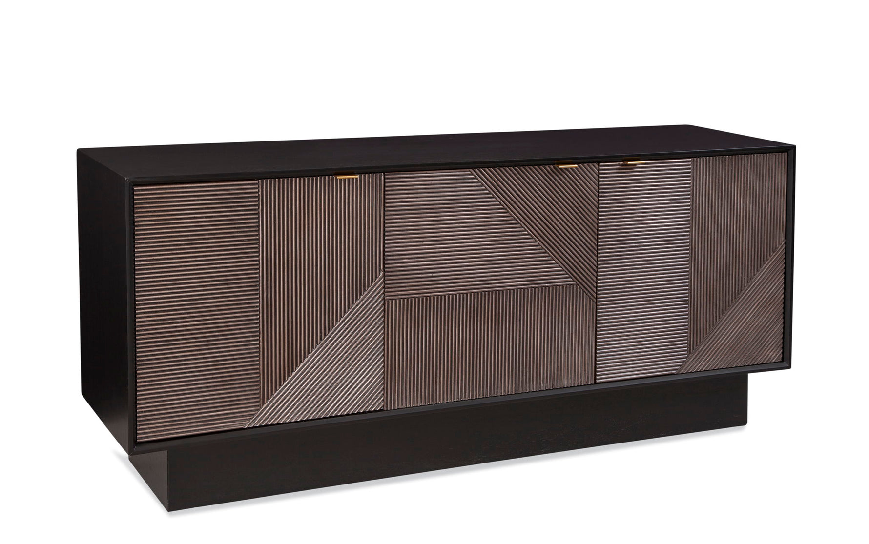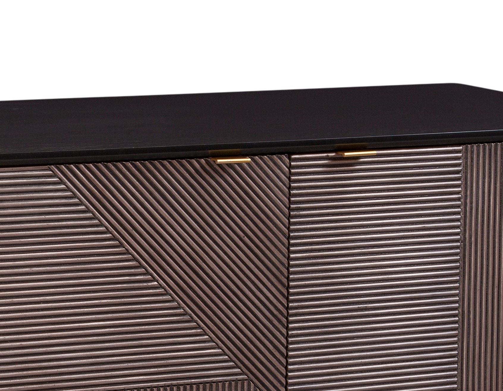 The Beader Server features a black and bronze finish with a ridged angled door motif. The 3 doors feature gold linear door pulls and hand cutouts for ease of mobility. Each cabinet has a stationary shelf, soft close hinges and magnetic door stops. Adjustable floor levelers included.