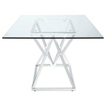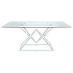 This glamorous dining set comes complete with a long table and chairs.A stainless steel base is polished to a lustrous chrome finish, topped by a thick tempered glass tabletop with a timeless beveled edge.Each chair features a rolled back with channel tufting for an Art Deco vibe.In addition, each retro style chair is wrapped in a soft dark velvet with finished legs that match the table base.Place this gorgeous table set in a contemporary dining room for an elegant dining experience.