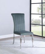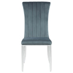 - Create a sophisticated setting for formal dining with this gorgeous velvet side chair.This posh piece from Coaster is beautifully crafted with soft, sumptuous, grey velvet upholstery.Vertical tufting gives it an extra touch of visual appeal.The comfortably padded seat sits atop a sleek, stainless steel base in a high-shine chrome finish.A subtle, rolled back rounds out its design in style.