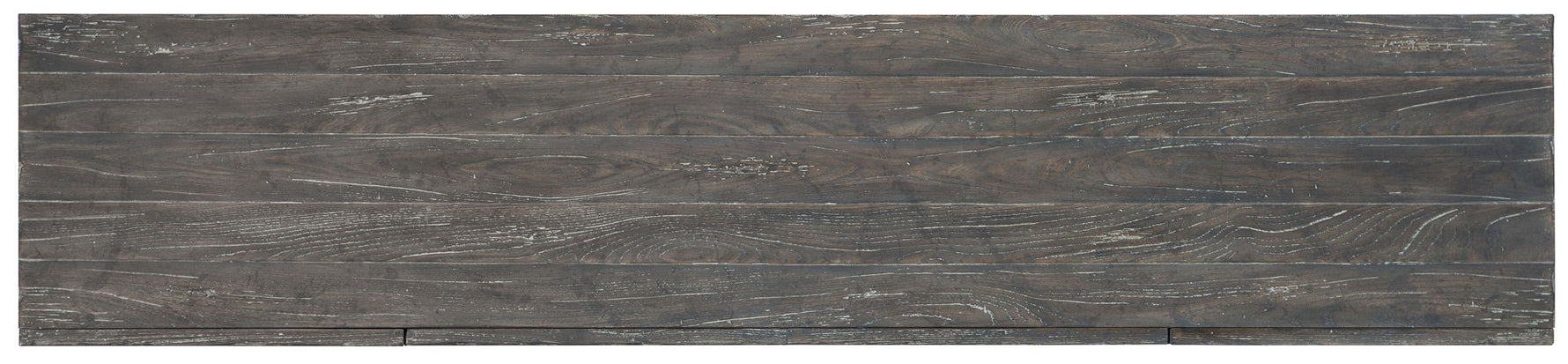 - Finish Description: Shale: a soft grey with natural wood undertones. Mottled copper hardware. Distressing includes rasping, chopping, gouging and worm holes.