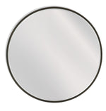 The Bedford Wall Mirror presents a round design with a modern industrial profile, boasting a black metal-like finish accentuated by a gold brushing overlay. Its sleek, thin frame complements modern minimalist styles effortlessly. With its unique finish blending black metal and gold brushing, this large 48 inch round mirror makes a statement in any room.