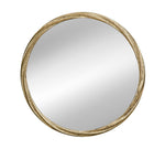 The Beekmann Hill wall mirror is round with a gold twisted frame. The frame is finished in a gold leaf and encircles the clear glass mirror.