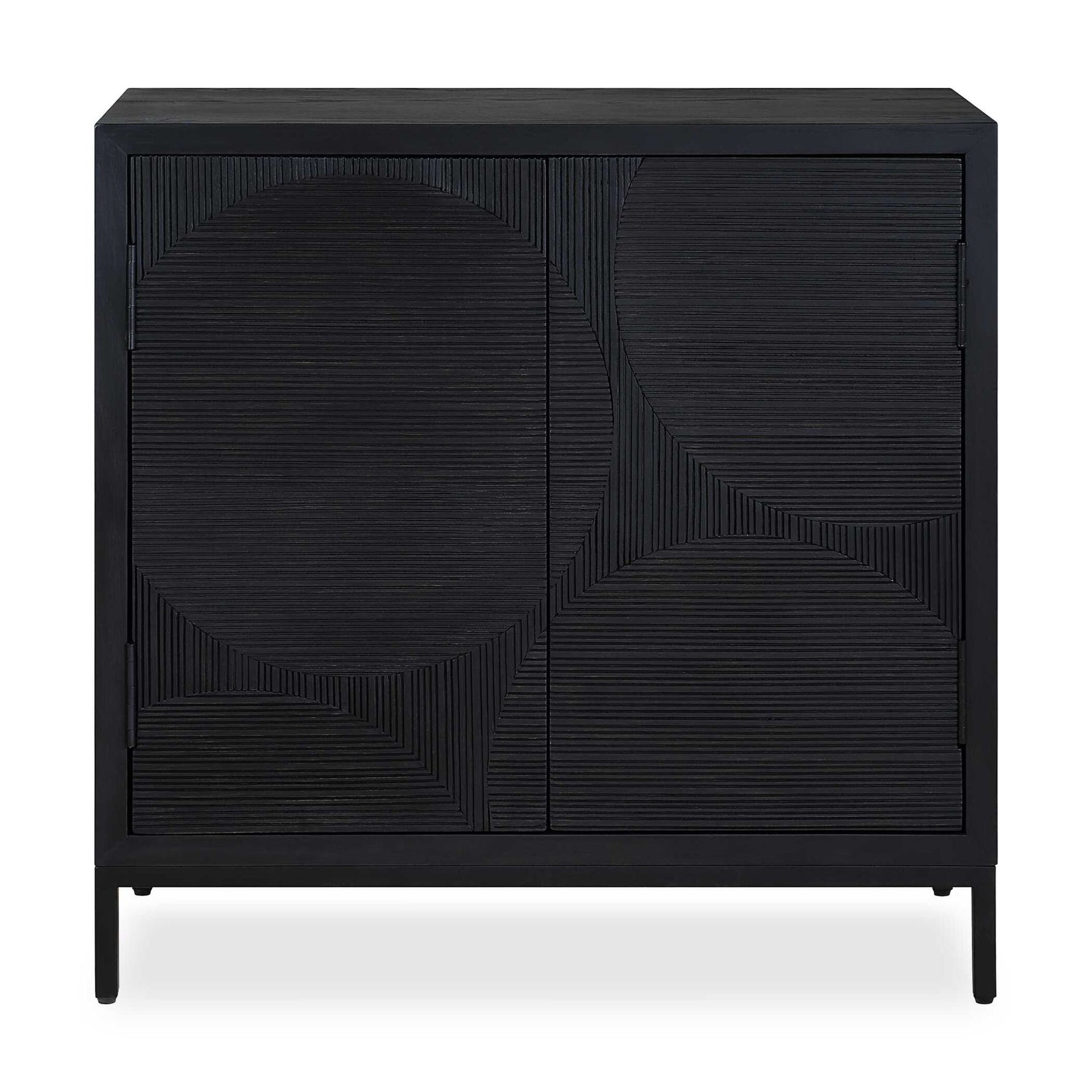 - This Cabinet Features A Stylish Carved Circle Pattern In A Chic Black Matte Finish, Giving The Cabinet An Unique Elegance. Push To Open Doors, Oak Grain, And A Thin Raised Metal Base Complete This Contemporary Look.