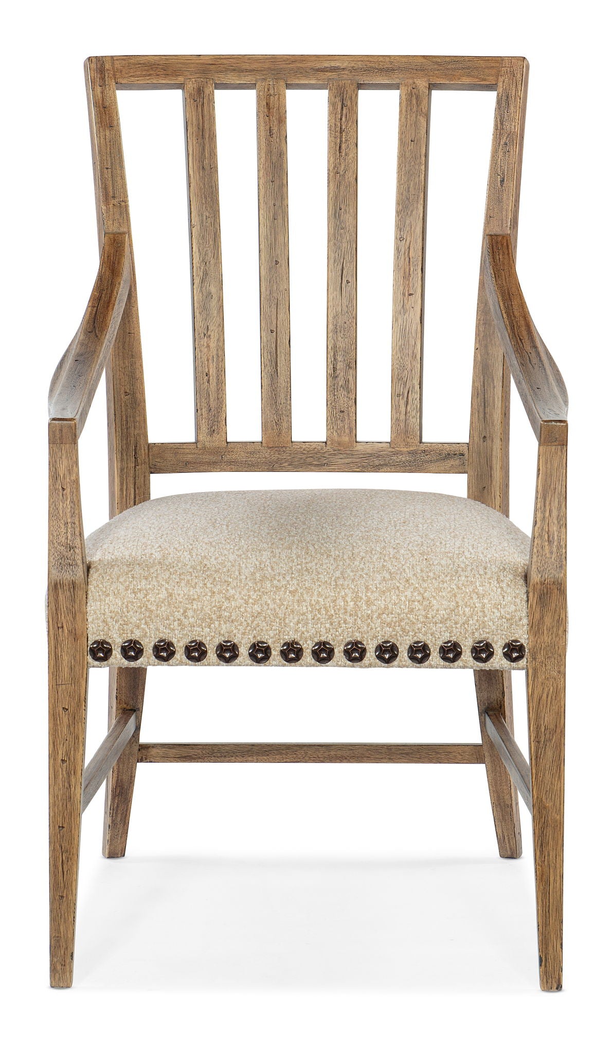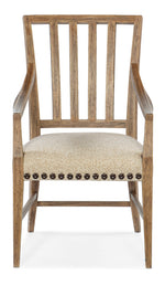 Unit price perInspired by the natural beauty of the American wilderness, the Big Sky Arm Chair has a stylized spindle back, shaped wood arms, legs and 3 stretchers finished in Vintage Natural. The seat is covered in the Saxony Porcelain performance fabric, and oversized nailhead trim adds flair.