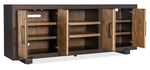 Inspired by the natural beauty, dramatic vistas and rough-hewn timber of the American wilderness, the Big Sky Entertainment Center is crafted of Pecky Hickory and Maple Veneers with a Solid Wood Edged top and two-tone finish. The exterior Dusk finish is a dark, rubbed-bronze metallic-like finish with a gesso texture. The interior Vintage Natural finish is warm, rustic and organic over Hickory Veneers with natural knots. Console features four doors with soft-close hinges, two adjustable shelves behind each pair of doors, two adjustable shelves in the center section and a ventilated back panel. There’s an FC705 three-plug outlet.