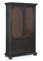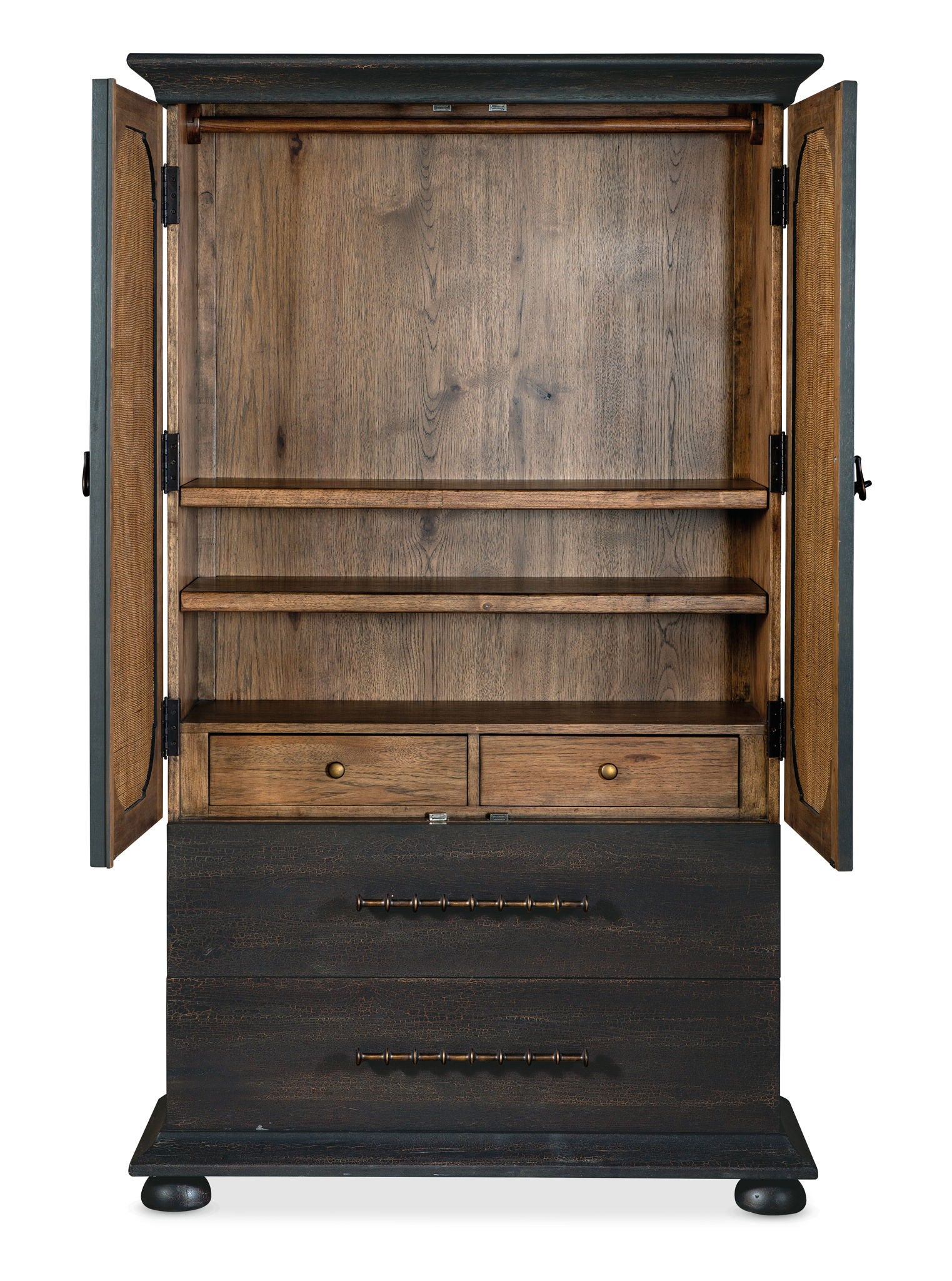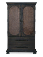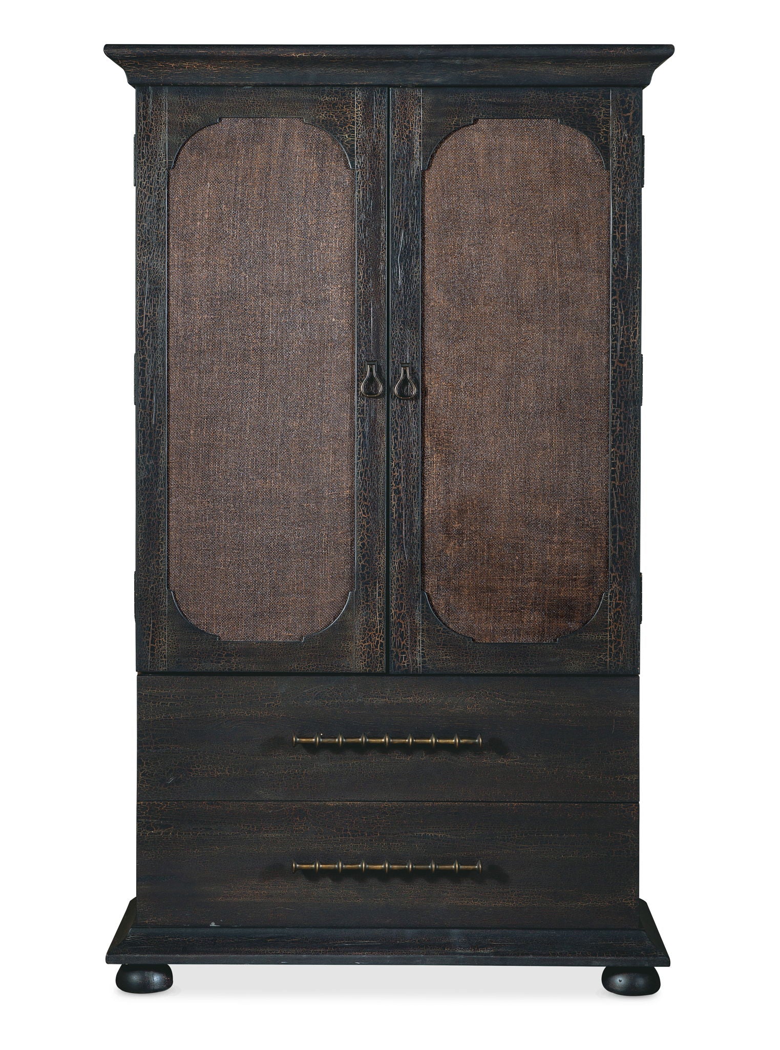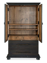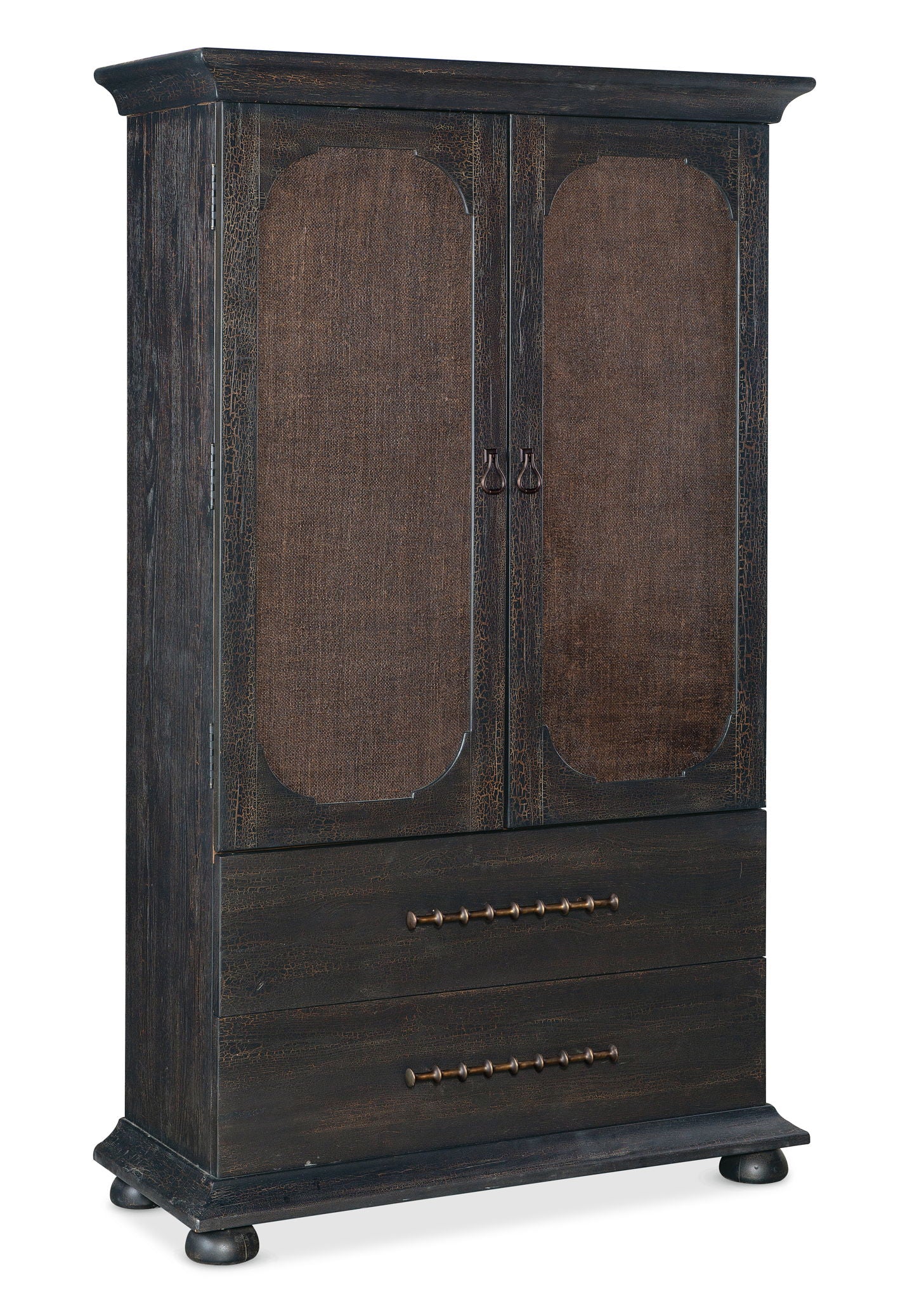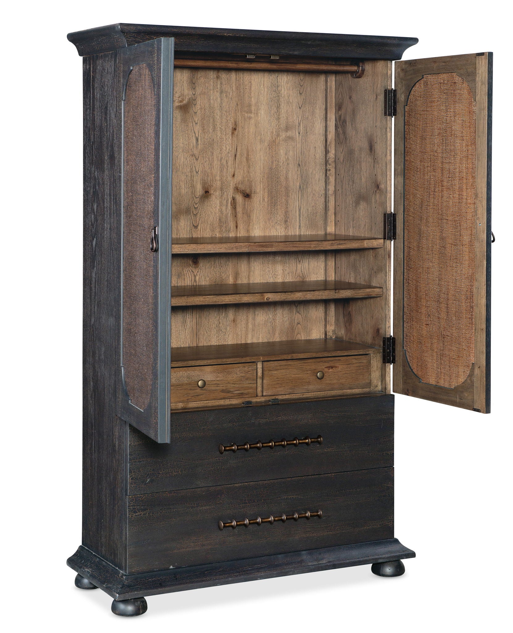 With a tactile appeal and a vintage design, the Big Sky Small Wardrobe is striking in a black Charred Timber finish over Pecky Hickory Veneers contrasting with finished burlap on the door fronts. Behind the two doors is one removable clothes rod, two adjustable shelves and four self-closing drawers. Accented by dark brushed bronze bar pulls and chic bun feet.