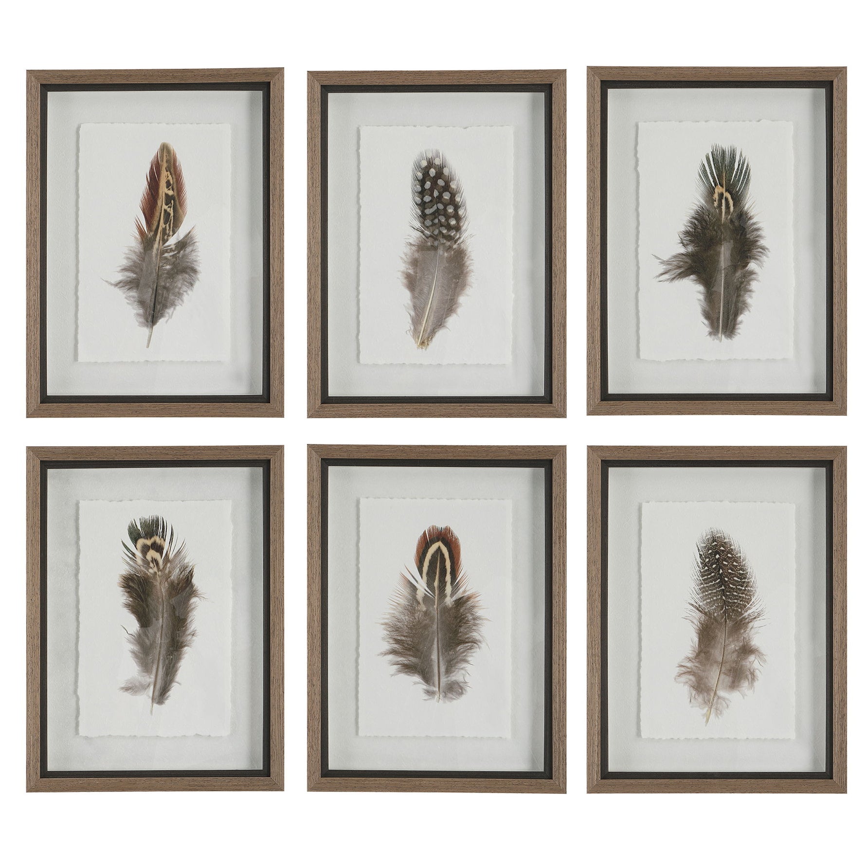 This Set Of Feather Artwork Adds Natural Charm To A Design. Each Exclusive Print Highlights A Different Flying Species In Various Brown, Cream, And Charcoal Tones On Textured Art Paper. In Addition To Hand Torn Deckled Edge Detailing, Each Piece Is Framed Shadowbox Style Against A Textured Paper Backing With A Rustic Wood Tone Frame And Distressed Black Liner Under Glass.