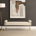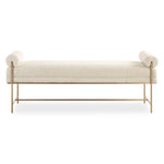 A Chic Accent Bench, Featuring A Supportive Yet Stylish Stainless Steel Frame Finished In Brushed Brass With Fixed Bolster Pillow Accents. Upholstered In A Textured Boucle Polyester In Pearl White. Seat Height Is 19".