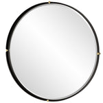 This Large Round Mirror Showcases A Strap Style Iron Frame Finished In A Sleek Matte Black With Soft Curved Ends That Encompass Antique Gold Column Medallions. The Floating Style Mirror Has A Generous 1 1/4" Bevel.