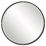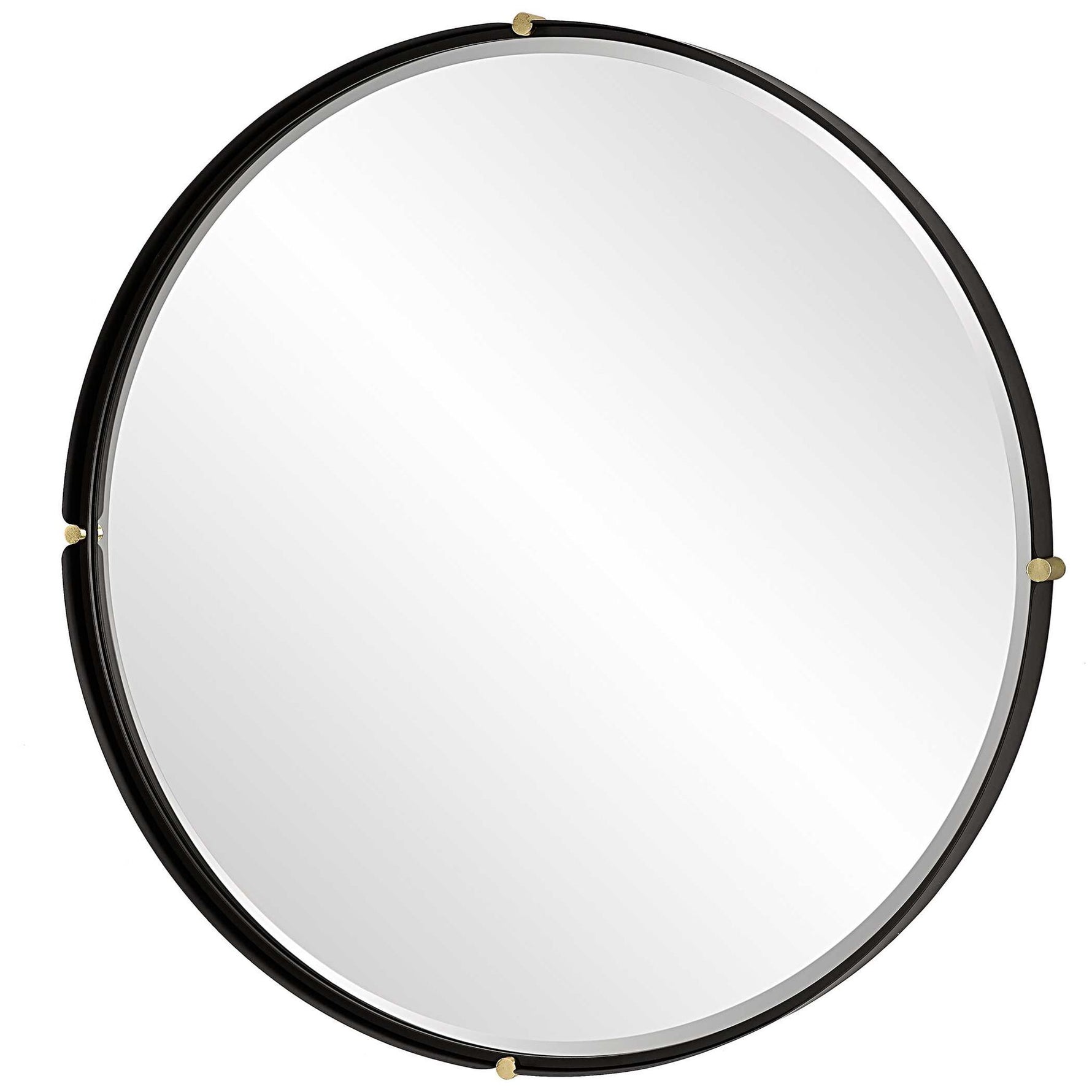 - This Large Round Mirror Showcases A Strap Style Iron Frame Finished In A Sleek Matte Black With Soft Curved Ends That Encompass Antique Gold Column Medallions. The Floating Style Mirror Has A Generous 1 1/4" Bevel.