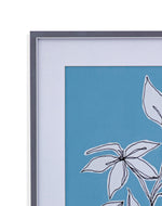 Botanic Drawing I features simply sketched flower on blue background with white matte on simple gray wood frame.