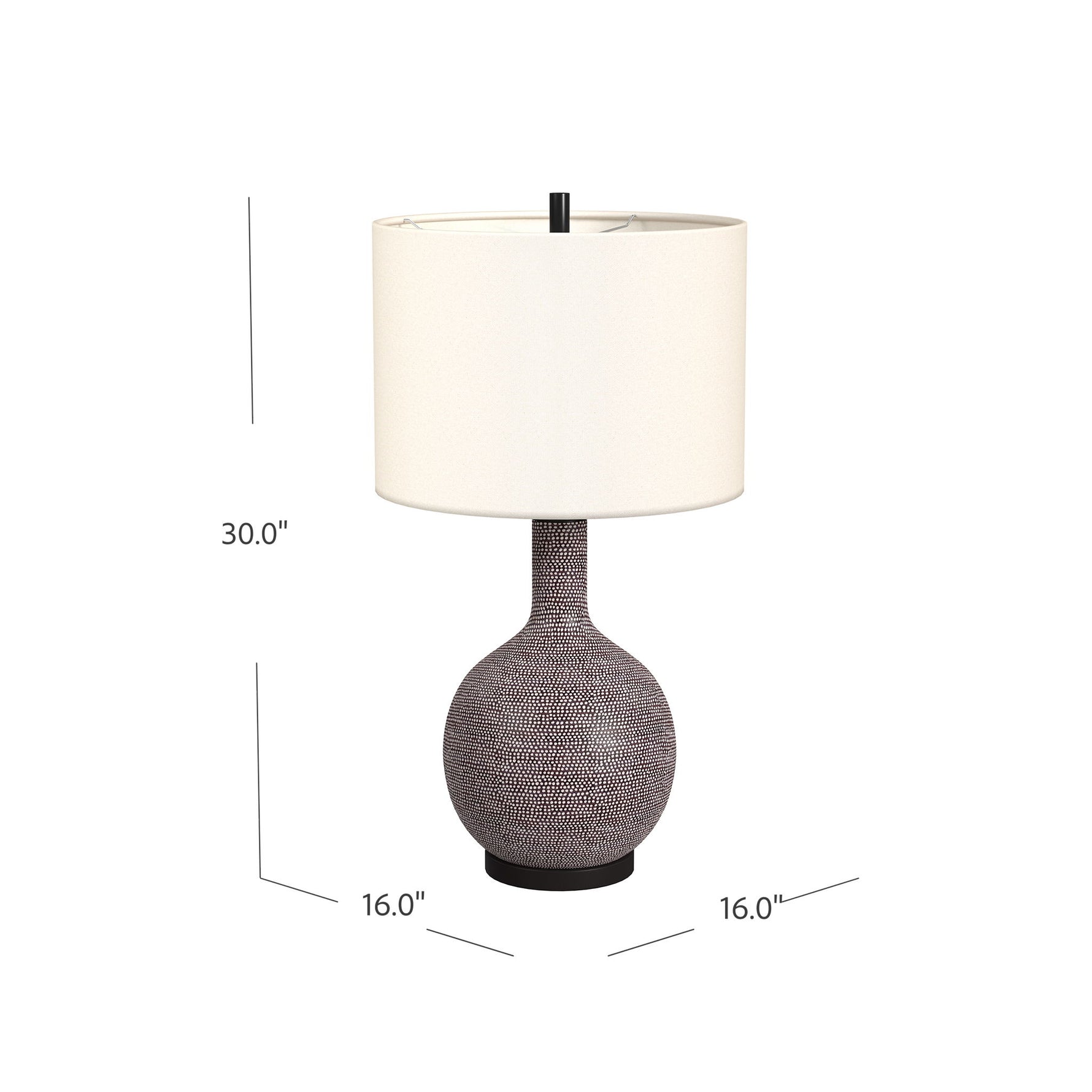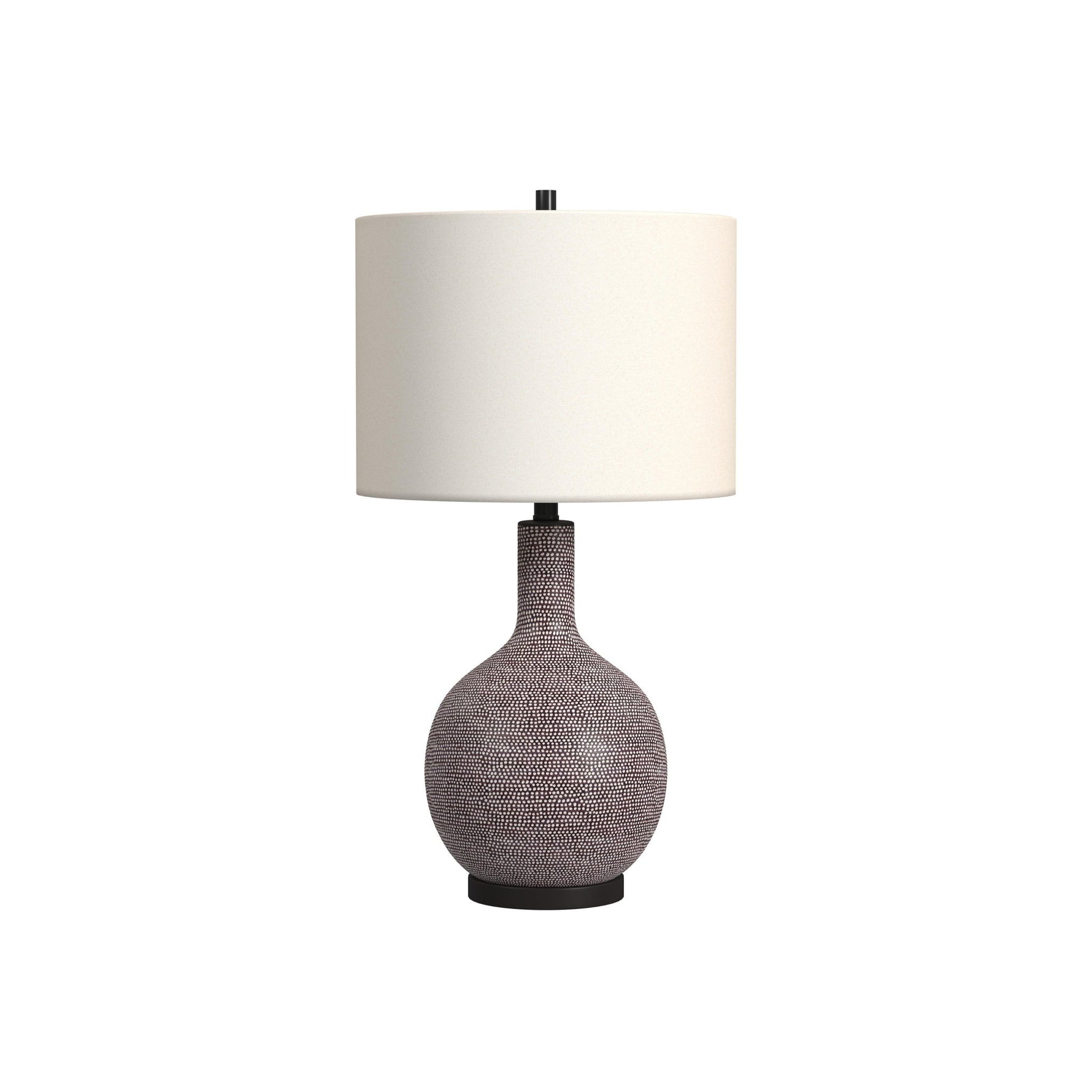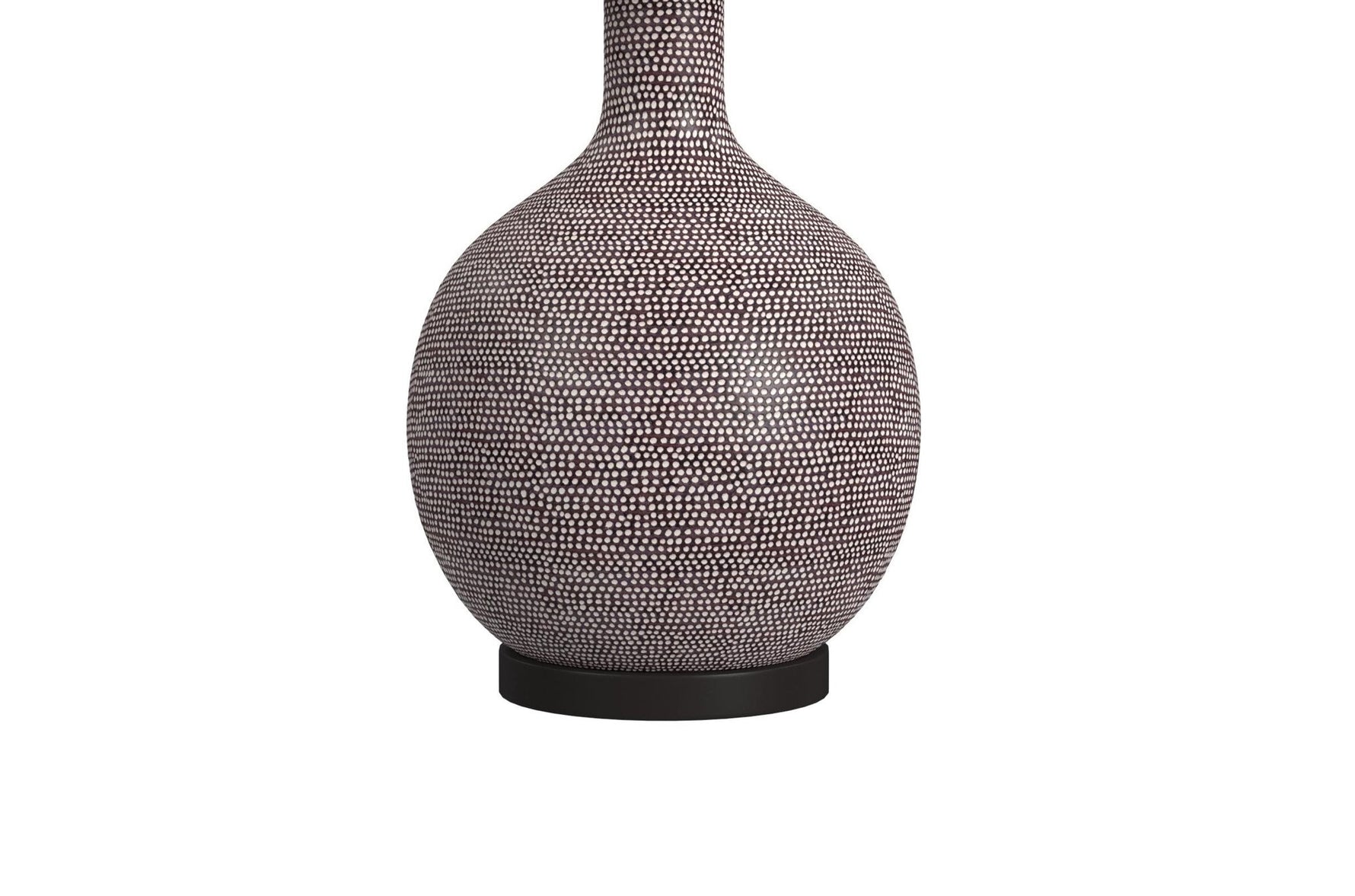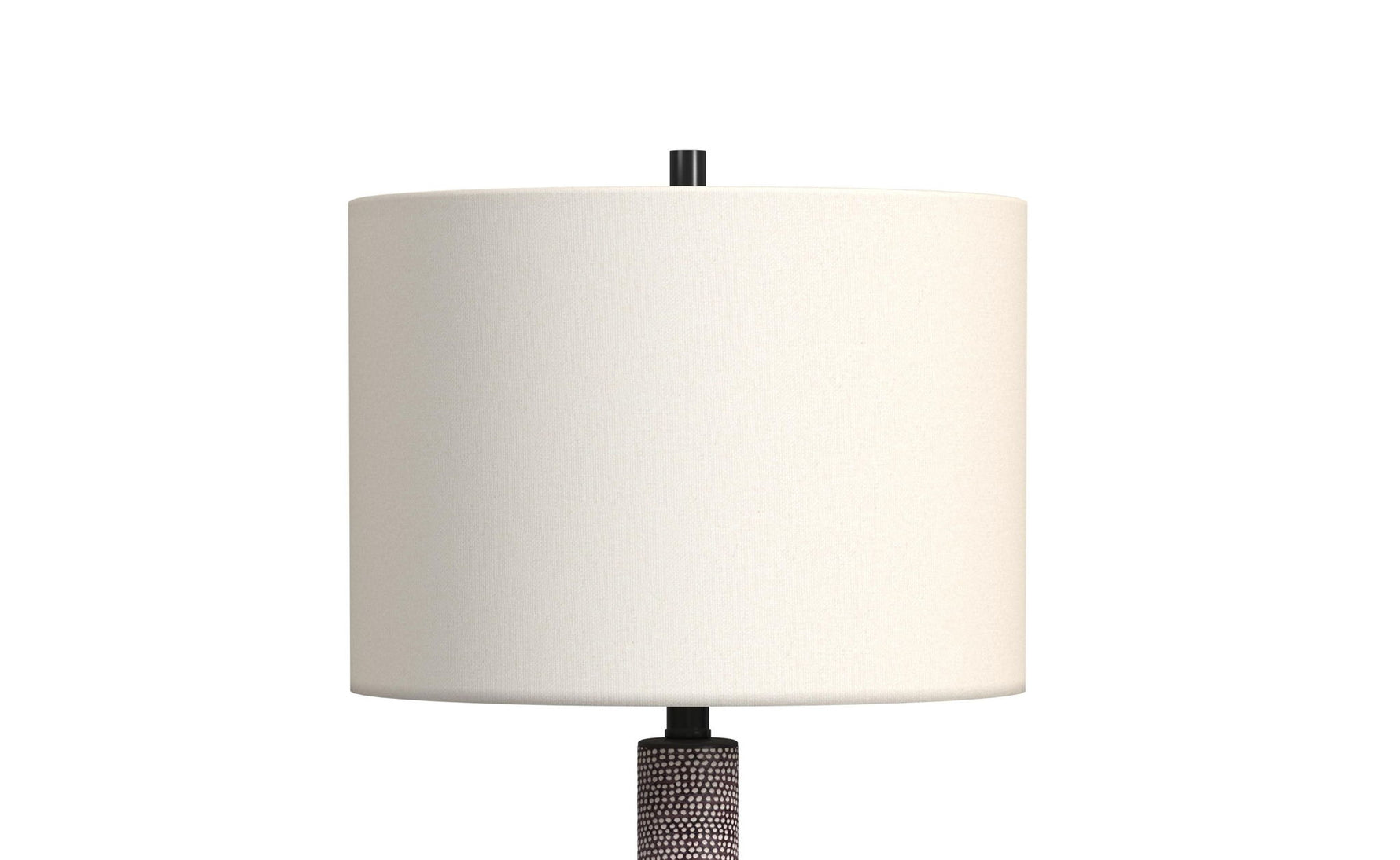 The Boylston Table Lamp features an earthy art deco style. The oatmeal colored linen drum shad sits above the bulb shaped lamp body. The ceramic textured chocolate lamp base features cream colored textured polka dots and a dark chocolate painted cylindrical finial. The hand crafted details are produced by a skilled artist, lending itself to a unique technique and that may feature slight variation between each piece.