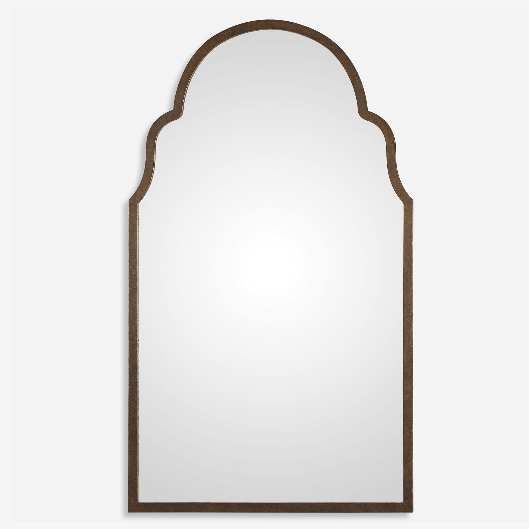 This Shaped Mirror Features A Hand Forged Metal Frame Finished In Lightly Textured, Dark Brown With Burnished Edges And Gold Highlights.