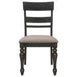 This set of two dining side chairs defines the classic traditional aesthetic with an extra dose of bold, opening up multiple options for assembling a dining space you’ll come to love. Asian hardwood and wood products construction is sturdy and stable, reflecting the best of old-style quality. With a dramatic charcoal sand through finish and notable farmhouse-inspired details that include a flared back silhouette, a ladderback design, and turned front legs. A lightly curved side silhouette offers tapered back legs. Dine or relax with comfort in padded chairs featuring textured light stone brown fabric upholstery.