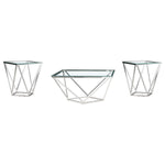 This modern coffee table set features a bold geometric design, combining polished nickel-finished steel bases with clear tempered glass tops. The tempered glass surfaces are scratch-resistant and easy to maintain, making them ideal for everyday use. The open-frame design enhances the airy, contemporary aesthetic, perfect for minimalist or industrial-inspired interiors. Crafted with durable materials and an elegant design, this set brings style and functionality to any modern living space.