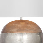 The Brock Table Lamp features mango wood round base with a silver metal band with a white tapered shade.