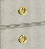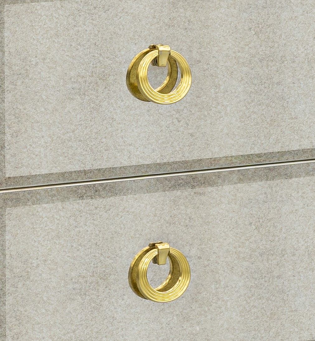 - Round golden drawer pulls contrast beautifully with the muted tones for a luxurious touch