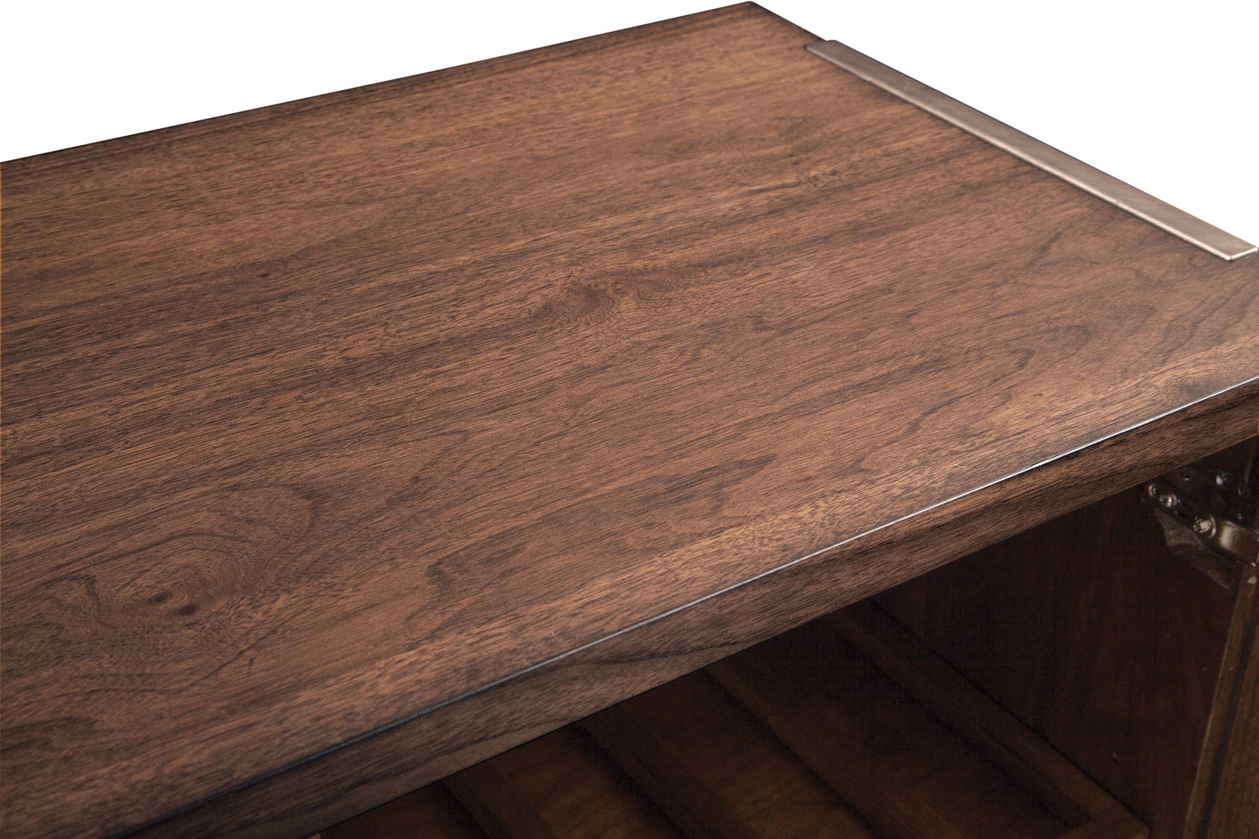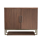 The Brooke Cabinet features slick, modern styling with mid-century elements. Inset brushed metal frames and supports the brown knotty wood, two door cabinet above the lower exterior shelf. The doors open with brushed metal bar pulls revealing two adjustable shelves, stemware and bottle storage.