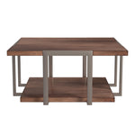The Brooke Cocktail Table features slick, modern styling with mid-century elements. Inset brushed metal frames support the top and lower shelves, which are finished in a rich brown knotty walnut.