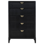 Add abundant clothing and accessory storage in a stylish bedroom with this modern five-drawer chest. Its compact profile fits virtually anywhere, while a chic look is created with fluted drawer fronts that add impressive dimensionality. A black finish imparts sophistication, while wire brushing creates a subtle sense of texture and depth. Each drawer front is adorned with a half-moon handle in a soft golden metallic finish that adds a perfect hint of warmth. The top drawer of the chest adds felt lining, perfect for protecting delicate items.