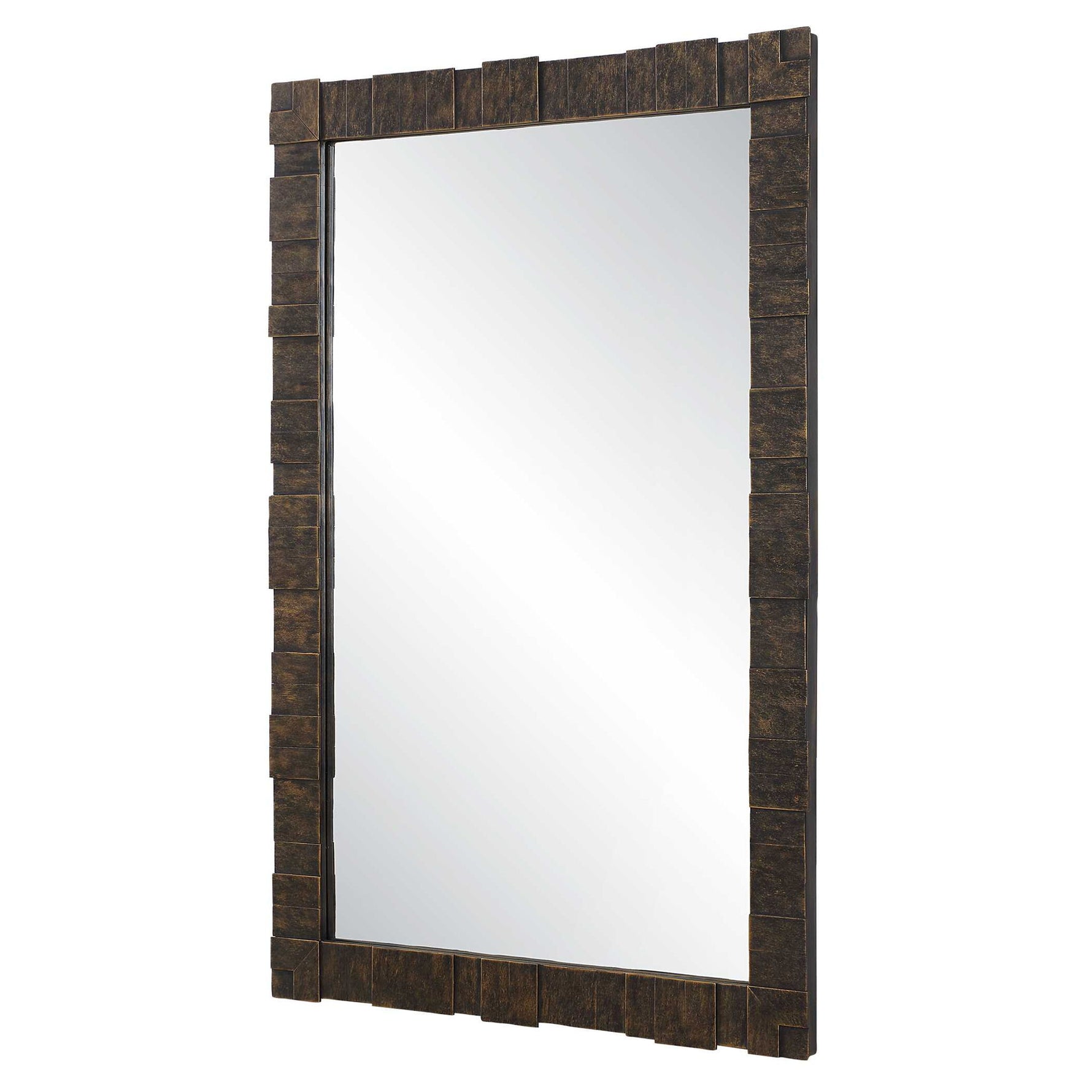 The Bustelo Mirror Showcases A Striking Geometric, Layered Metal Frame, Enhanced By A Heavily Distressed Dark Bronze Finish With Antique Gold Undertones, Adding Depth And Texture To Any Room. May Be Hung Horizontal Or Vertical.